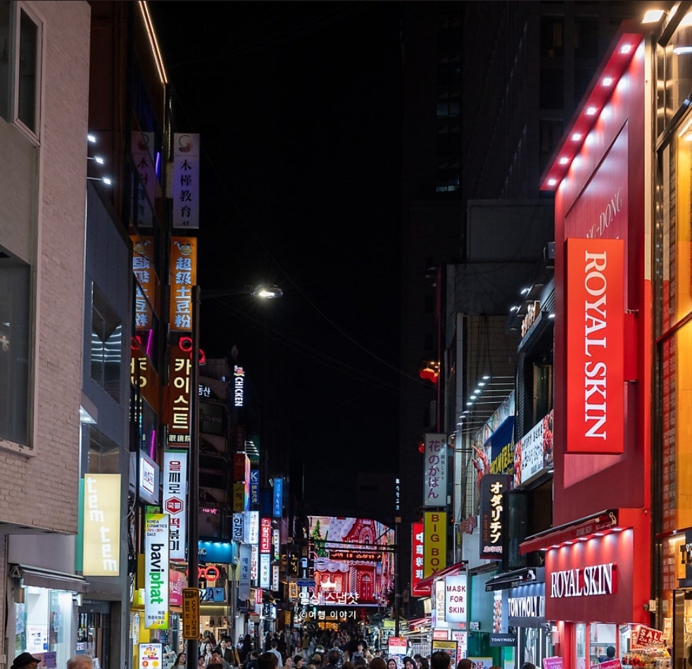 쇼핑 천국: 글로벌 브랜드 매장, K-뷰티 화장품샵, 로드숍이 줄지어 있어 볼거리 풍성